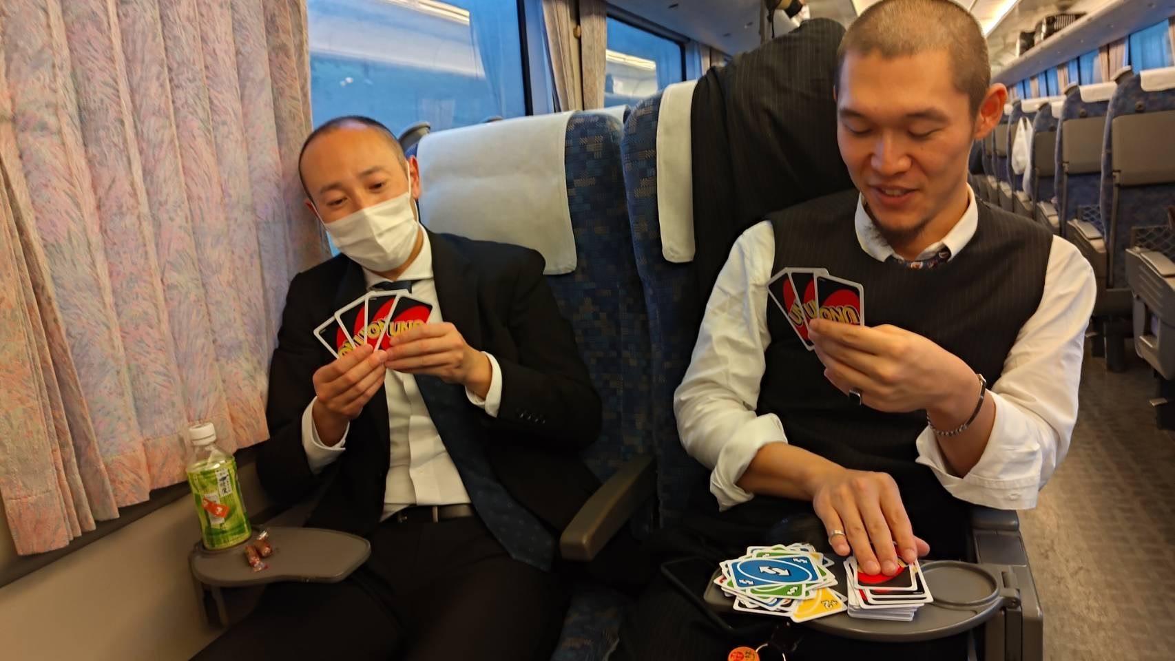 京都からの帰りは土地委員長が用意してくださったUNOを大の大人4人で熱中しておりました。最初はドロー4を出すのも遠慮がちでしたが30分後にはお構いなしにドロー2からのドロー2さらにそこからドロー4と地獄の8枚引きと大いに盛り上がりました、大人とやるUNOはめちゃくちゃ楽しい!!