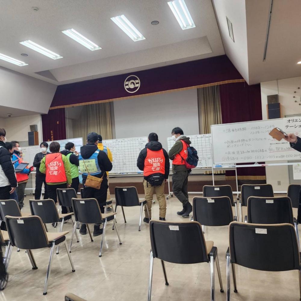 到着した我々はスタッフの方から説明を受け、当日の流れを教えてもらいました。私自身、七尾のボランティアは初参加で何をすればよいか不安でしたが、綿密に練られたスケジュールや割り振り、各班に頼もしいリーダーが居て、終始安心して行動することができました。