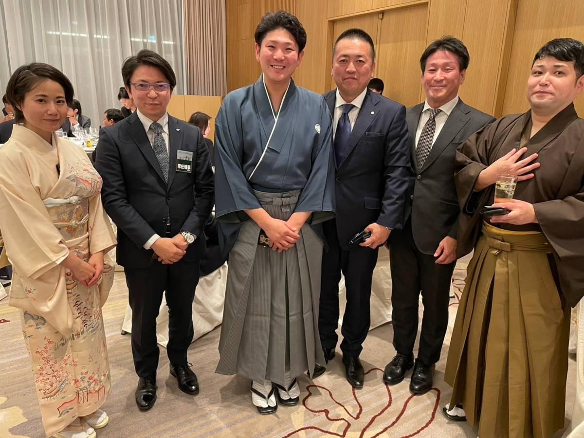 今回の茶会では、大井山理事長の「せっかくだから、着物を着てお茶会に出たい!」という夢もかなえられました。これはシニアの熊本先輩にご協力いただいて実現しました。ドレスコードの指定はなかったのですが、着物を着ている人は女性が多く、男性だと主催者くらいで、御家元までスーツで着ていらっしゃって、着物の男性は十分、注目を浴びたと思います。大井山理事長も福島委員長も和装が似合いますね。