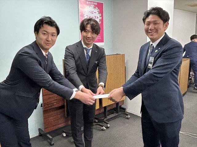 何だろうと思っていたら、交流委員会の東委員長と中松幹事が登場し「おめでとうございます!」と紙袋を手渡されました。そう、この日3月7日は、私の35歳の誕生日でした。思いもよらぬサプライズに大変驚くとともに、わざわざ駆けつけてくれた二人に大変感激しました。
