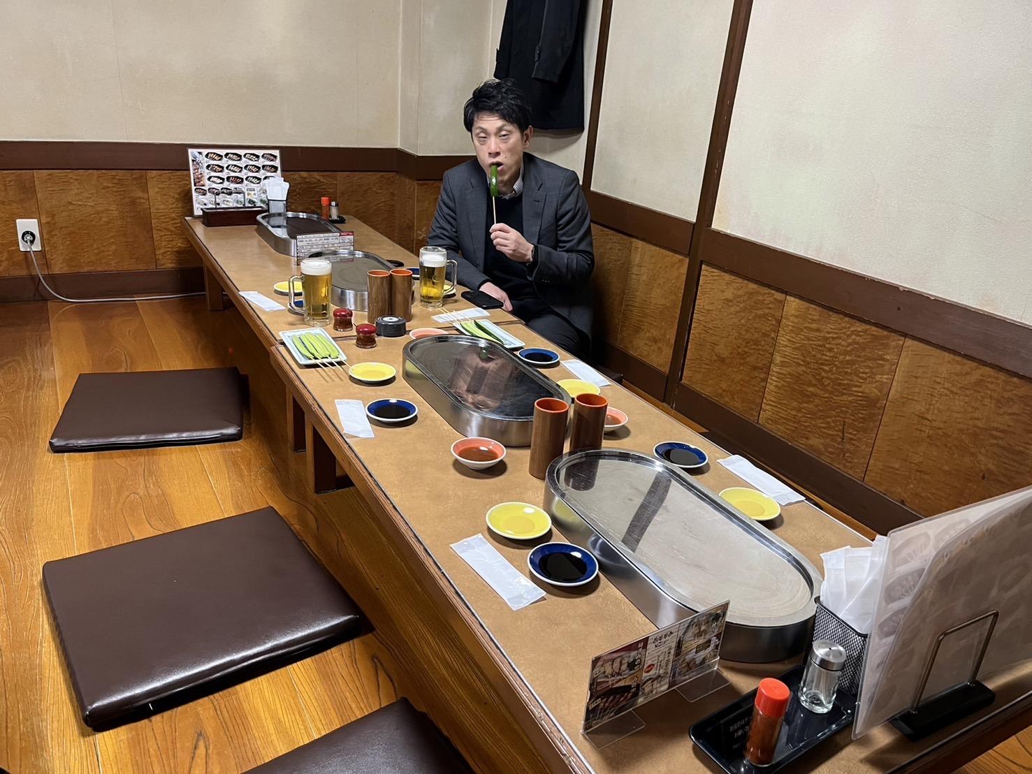 そんなこんなで熱のこもった会議が終わったのは22時過ぎでした。「会議が遅くなったため、サクッとやりましょう」とはじまった懇親会でしたが、突如、西村専務から「ゲストが来るので席を増やして」との指示が。。。