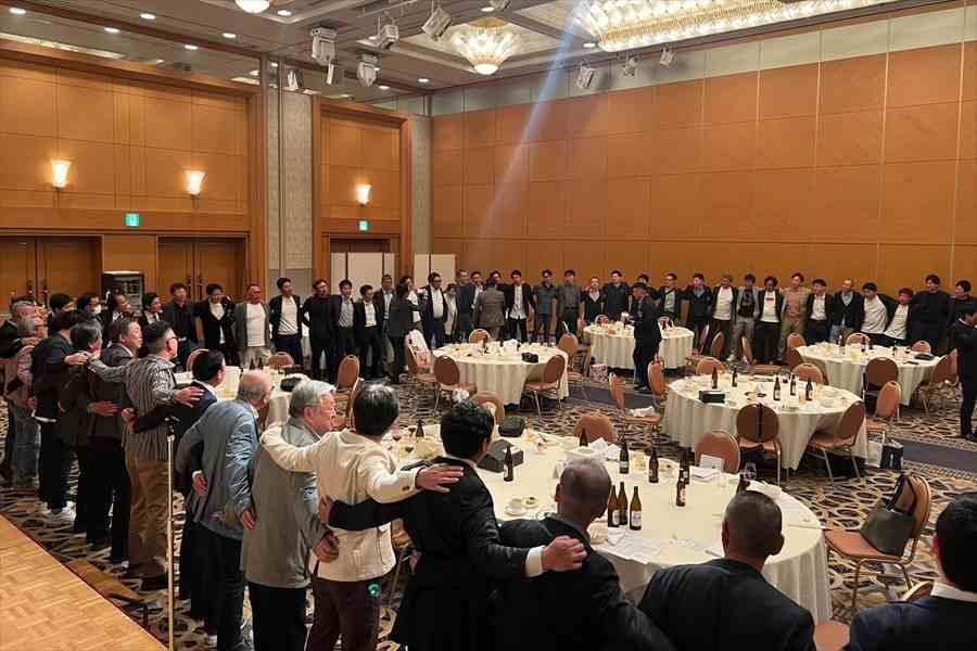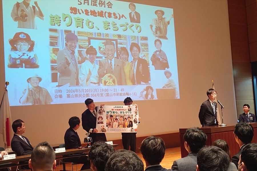 表書式の後、富山市長の藤井先輩にご挨拶をいただき、長谷川先輩の中締めのご挨拶と人生のオアシスを行い表彰式が閉会となりました。表彰式終了後に当委員会の東委員長にご挨拶の機会をいただき、途中珍しく言葉を詰まらせるお姿には本事業への熱い想いと大変であったことなどが詰まっていたのではないかと感じます(涙されるのではないかとびっくりしていました)。その後の委員会懇親会ではいつも通り写真撮影を忘れてみんなと一緒に乾杯をしてしまい、乾杯TAKE2をお願いすることとなりました。