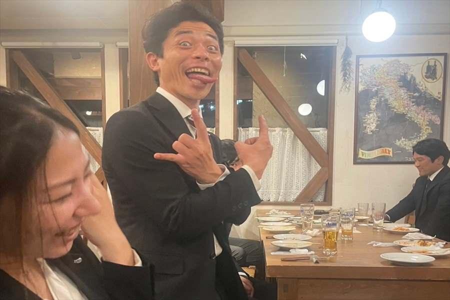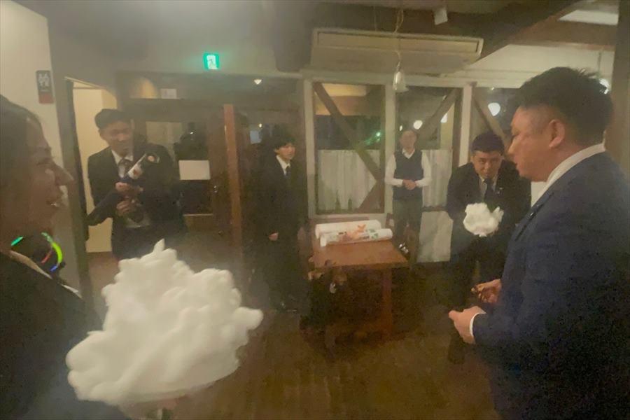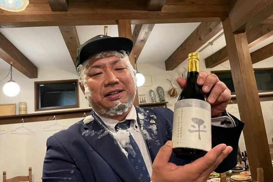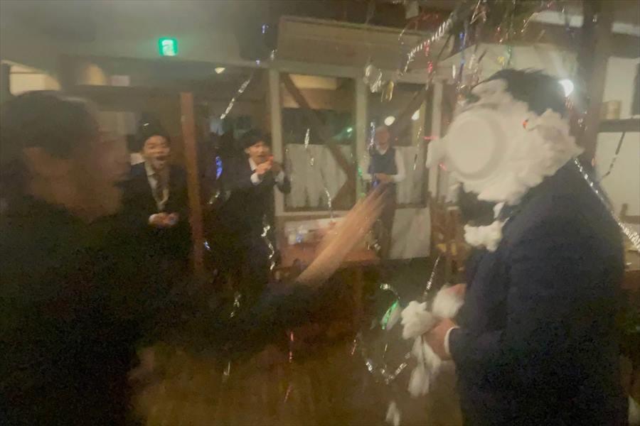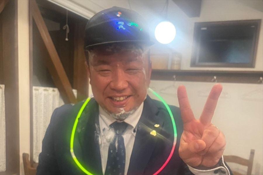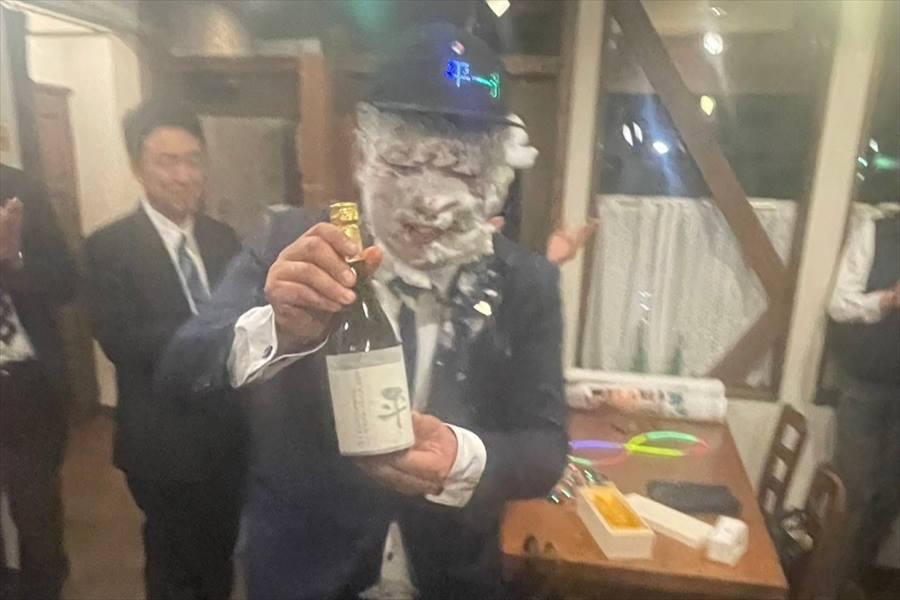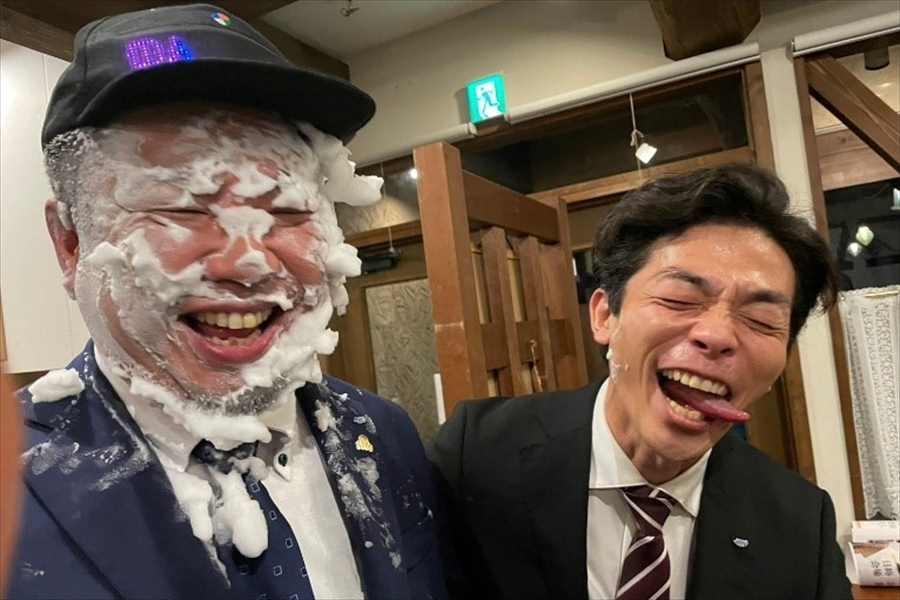 お祝いにパイを投げられ真っ白な顔の平幹事に、してやったりの川岸幹事