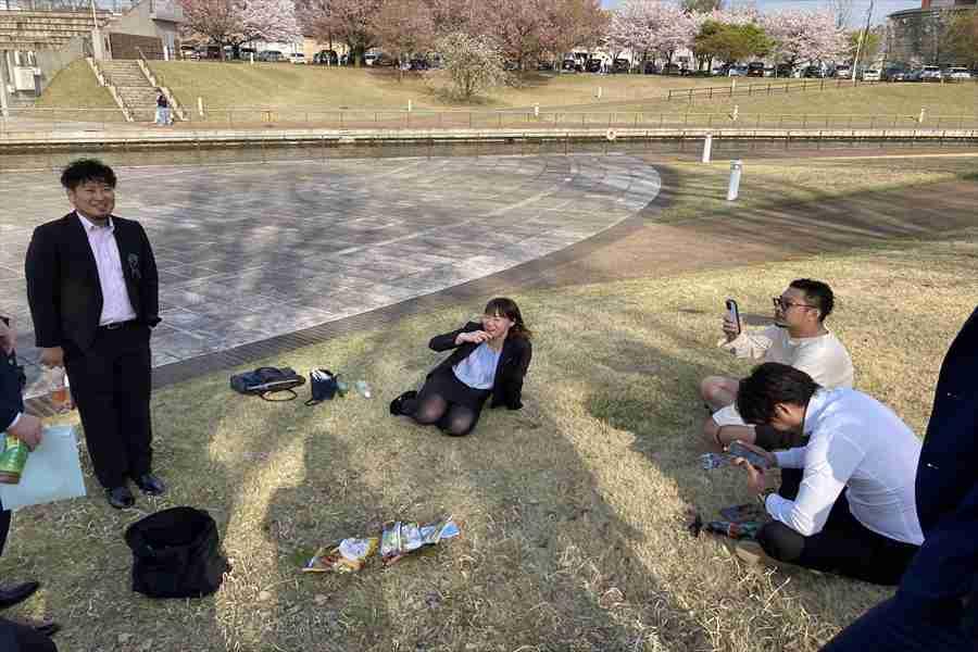 4月14日(日)の午後、桜が咲き誇る環水公園にて、我々アカデミー委員一同が集まりました。集合する際の服装は、黒スーツにサングラス。それはなぜか?当日の出し物の準備の為です!私は少し遅れて合流しましたが、花見客で賑わっている公園内を歩いていると、すぐに不審な集団を発見できました。不審すぎて一般の方が誰も寄り付いていない印象を受けました。そして、J(ジェイ)こと多田委員を中心に、奇異の目に晒されながらも撮影が続き、無事クランクアップを迎えることができました。