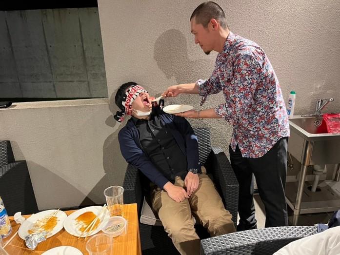 先日の交流事業よろしく、目隠しをしての食べ物当てゲーム!!!サーモンとマグロを間違える谷内さん!イカ焼売とエビ焼売を間違える谷内さん!!そのちょっと前まで寝ていた谷内さん!!!間違いなくこの日のMVPは谷内さんでした笑。