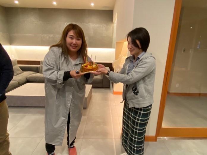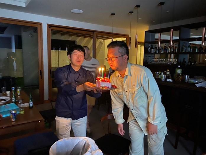 突如、ケーキが運ばれ5月生まれの坂田副委員長、水間幹事、竹原委員のハッピーバースデー!!!
