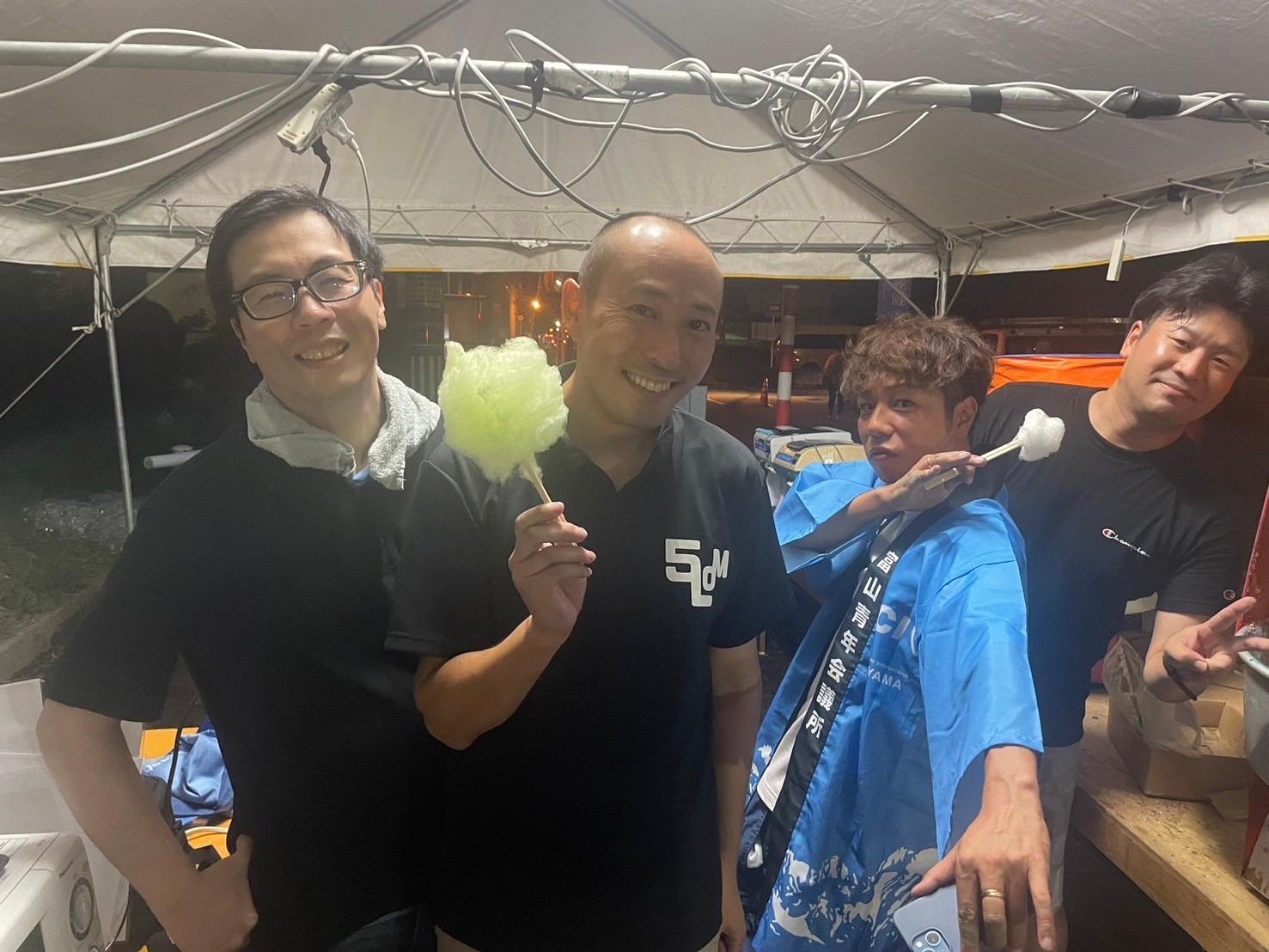 そんなカラフル綿あめを横目に私は、かき氷販売をお手伝い。ラブさんこと中川運営幹事から「赤井さん、かき氷の作り方はこんな感じです」と30秒程度の的確なOJTを受け、いざ実践。船田副理事長からは作り方がまだまだ未熟だねと、激励を受けつつ、会計係の片山副委員長、かき氷作りの田島委員、赤井、シロップ担当の中川運営幹事のスーパーフォーメーションでどんどんお客さまを捌いていきました。