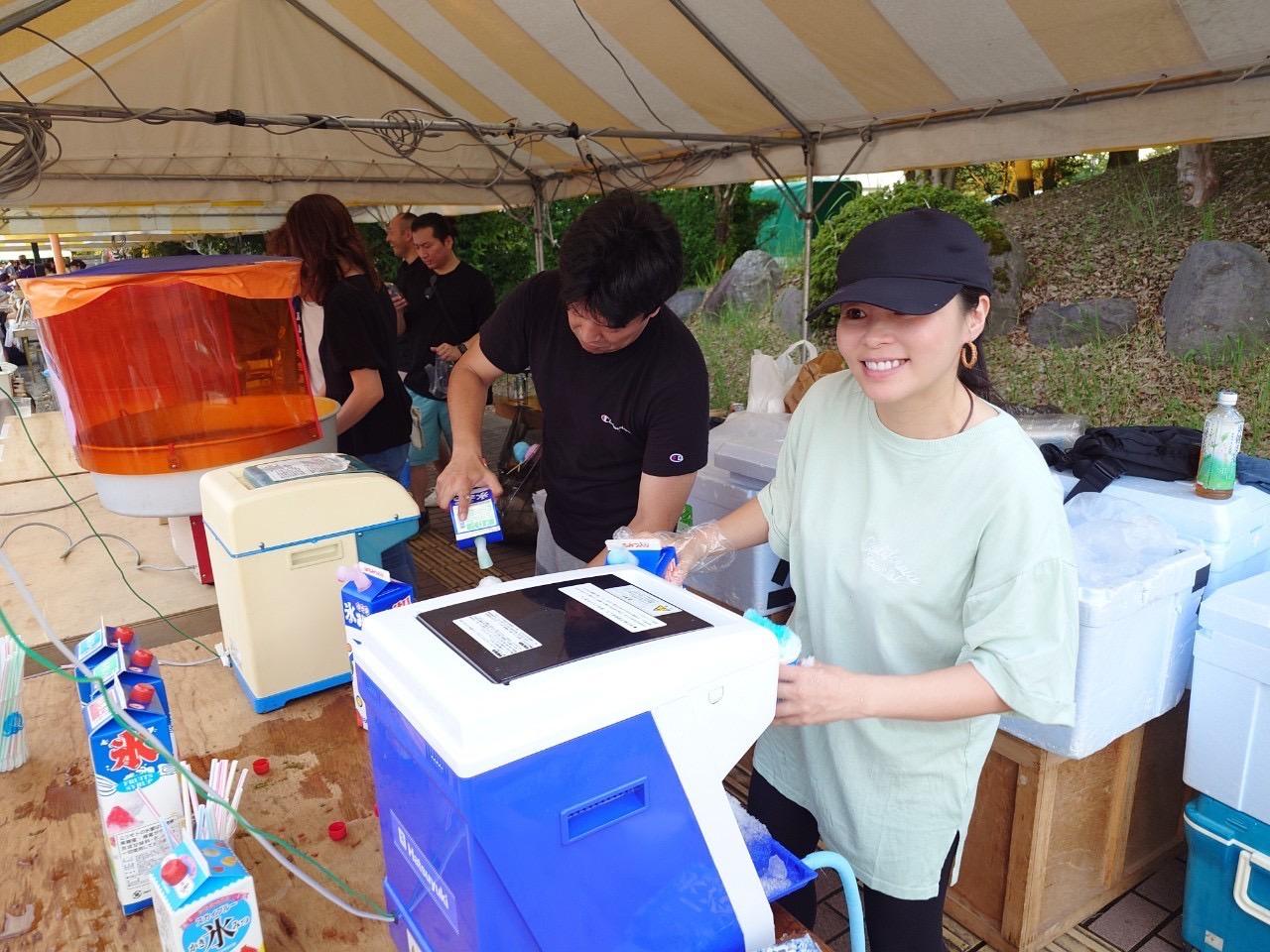 私が到着した17時にはお祭り開始1時間前にも関わらず、ちらほらと市民の方が来ておりました。また、屋台開店前ですが、既にかき氷や綿あめを求めてこられるお客さまがいました。かき氷を作ったことのない私に同期のKPこと川岸幹事が、YouTubeで勉強したというかき氷の作り方をレクチャーしてくれたおかげで、ド素人の私でもそれっぽいかき氷を作れたと自負しております!!