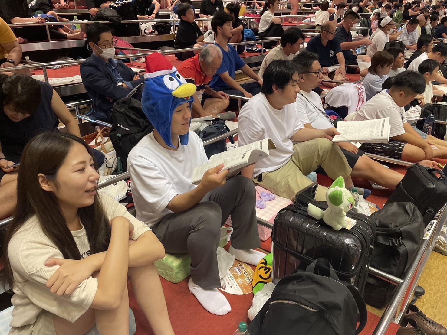 リハーサルは順調に進み、気がつけば子どもたちを相撲部屋まで引率する時間です。相撲部屋での宿泊に関しては、次世代委員会の頭脳・河合幹事がメルマガを執筆していただいているかと思うので割愛し、ここで子どもたちは一旦、お別れです。私たちも、明日の応援に備えて、今日は大人しくホテルに行き、早めに就寝をしようー・・・とは、もちろんいくわけもなく(笑)。本番で声を出すための準備?と理由をつけ、お腹を満たし、長時間の座りっぱなし対策としてド○・キ○ーテにて急遽クッションを購入し、さらに喉を潤しながら東京の夜は更けていきました。